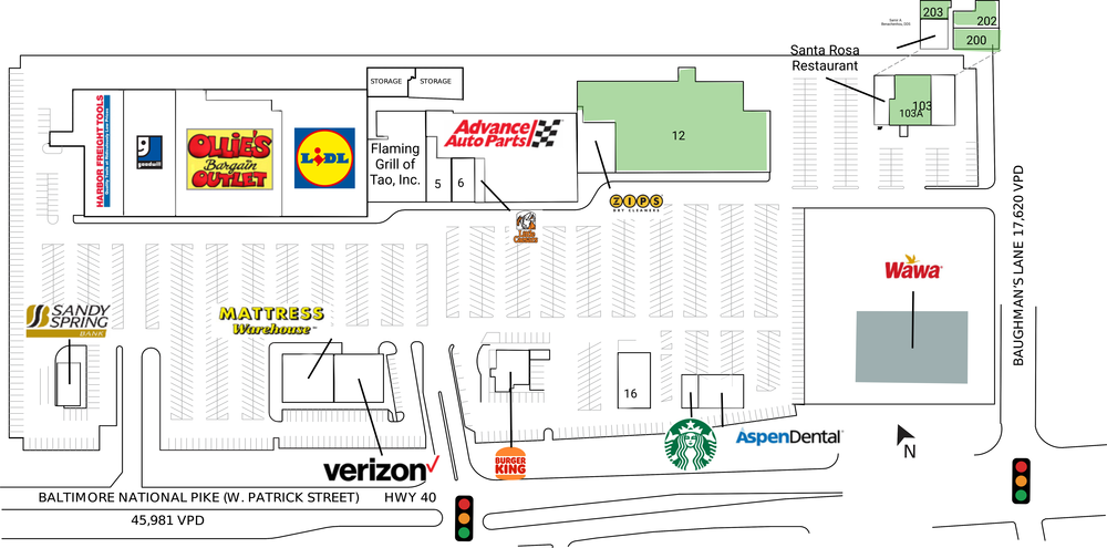 - Easy access with a fully signalized entrance on Rt. 40 ("The Golden Mile") and additional access via Baughmans Lane